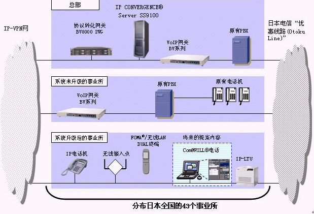 CONVERGENCE® Server SS9100(以下簡(jiǎn)稱(chēng)SS9100)"為基礎(chǔ)的IP Centrex系統(tǒng)(注1)。預(yù)計(jì)在2007年構(gòu)筑完成連接其分布日本全國(guó)各地的43個(gè)事業(yè)所的企業(yè)內(nèi)部IP