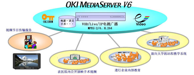 在OKI的通用視頻服務(wù)器系統(tǒng)上,將具有代表性的視頻傳輸功能作為標(biāo)準(zhǔn)服務(wù)要素,以解決方案的形式提供給用戶。以VOD(視頻點播)實時傳輸系統(tǒng)、中繼及監(jiān)視系統(tǒng)為代表,可以簡單便捷構(gòu)筑靈活運用視頻及語音的豐富多彩的系統(tǒng)。URL:http://www.oki.com/jp/BMC/。