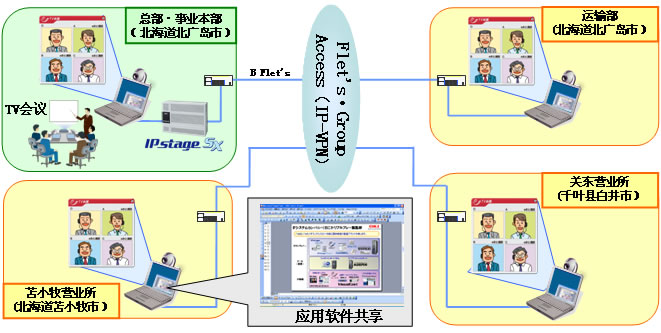 此次開始投入運(yùn)行的IP電話系統(tǒng),在其總部導(dǎo)入了“IPstage SX”,通過沖電氣的“Com@WILL軟電話”具有的TV會(huì)議功能,能將包括總部在內(nèi)的北海道3個(gè)事業(yè)所與關(guān)東營(yíng)業(yè)所進(jìn)行電話聯(lián)網(wǎng)。各個(gè)事業(yè)所之間通過NTT東日本的IP-VPN服務(wù)“Flet's・Group”實(shí)現(xiàn)相互連接。