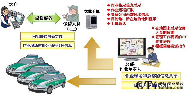 “MoBiz AP for CE支持系統(tǒng)”在加強總部和現(xiàn)場維修人員的聯(lián)動基礎上,通過準確把握地點信息和作業(yè)進展狀況,有效安排工作人員,從而達到提高工作人員一天的工作現(xiàn)場訪問次數(shù)。進一步說,有助于客戶SLA(注3)的遵守和客戶滿意度(CS)的提高。