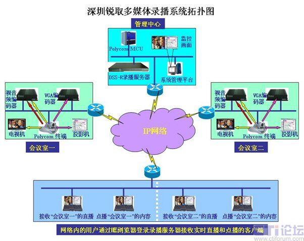 錄播服務(wù)器放置在管理中心,視音頻編碼器(采集聲音、圖像)放置在會議室,VGA編碼器(采集VGA信號)放置在會議室,客戶端分別為網(wǎng)絡(luò)內(nèi)的任意一臺計(jì)算機(jī)。整個(gè)系統(tǒng)簡單明了,分布靈活,無需專業(yè)布線即可完成安裝。各部分功能如下: