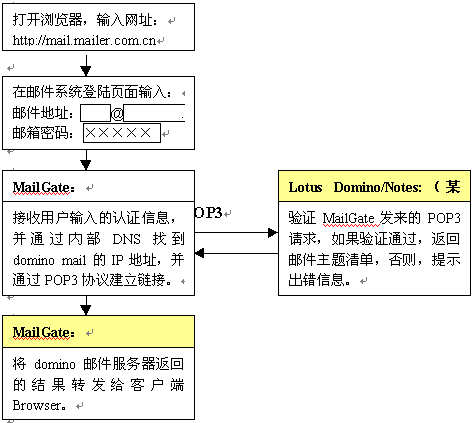 金笛郵件網(wǎng)關(guān)完全基于B/S架構(gòu)的設(shè)計,使得郵件收發(fā)、管理都是基于瀏覽器完成,客戶端只要打開IE瀏覽器即可,無需做任何設(shè)置,大大方便了用戶。也就是說,在城域網(wǎng)任一節(jié)點(diǎn),都可以通過內(nèi)部域名(DNS)訪問郵件網(wǎng)關(guān),然后通過郵件網(wǎng)關(guān)與用戶所在的domino郵件服務(wù)器通訊,將郵件主題、郵件內(nèi)容顯示在web頁面上。金笛?郵件網(wǎng)關(guān)的具體工作流程如下: