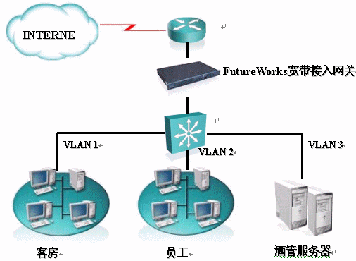FutureWorks寬帶計費系統(tǒng)針對南京大飯店上網(wǎng)計費的解決方案結構圖