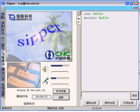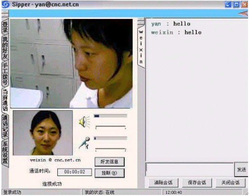 點擊后會出現(xiàn)對話窗口,同時在對方的機器上會出現(xiàn)你的呼叫請求,如果對方"接收"了你的請求,則兩個人的語音對話開始,雙方可以互相聽到聲音,沒有圖象,可以同時進行短信交流。