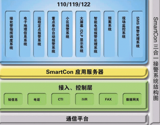 110/119/122等系統(tǒng)和一般企業(yè)的客服系統(tǒng)和熱線系統(tǒng)有一定的共性,但它們肩負著保障社會安定和人民生命財產安全的重任,這些決定了該系統(tǒng)的特殊性,使它有別于其他行業(yè)的應用。我們公司依托雄厚的技術開發(fā)力量,結合多年來在公安/消防/交通領域豐富的系統(tǒng)研發(fā)實施經驗積累,面向未來的發(fā)展,提出了以SmartCon呼叫中心平臺為核心的三體合一的、綜合的整體解決方案。該解決方案充分考慮到公安/消防/交通系統(tǒng)的現(xiàn)在和未來的發(fā)展趨勢,110/119/122三個系統(tǒng)既可分開單獨處理報警事務,也可整體考慮、整體調度。該解決方案涵蓋了電話報警、SMS報警、接處警指揮調度、電子地理信息系統(tǒng)(GIS)、現(xiàn)場監(jiān)視以及小區(qū)報警雄等等,各個子系統(tǒng)之間相對獨立,用戶可以根據(jù)實際要求,進行自由搭配,充分體現(xiàn)了系統(tǒng)的靈活性。