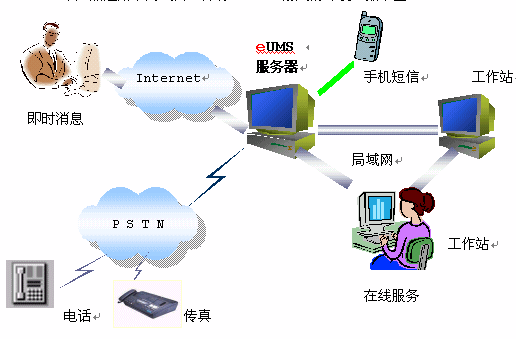 整個系統(tǒng)以eUMS服務器為核心,對內連接企業(yè)局域網,對外連接互聯(lián)網。eUMS內配置一塊語音/傳真卡,負責電話、傳真的接入。如果企業(yè)需要自己的短信服務,也可以在eUMS服務器上安裝手機短信網關,外接一部手機即可。