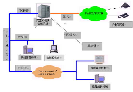 MCU-NT/I交互式電話會(huì)議系統(tǒng)為會(huì)議用戶提供了強(qiáng)大靈活的會(huì)議功能和豐富完善的網(wǎng)管功能。會(huì)議功能是在會(huì)議終端(或話機(jī))和會(huì)議控制臺(tái)上實(shí)現(xiàn)的;網(wǎng)管功能是在系統(tǒng)維護(hù)終端上實(shí)現(xiàn)的,并在靈活的組網(wǎng)方式中體現(xiàn)出它的方便易用。系統(tǒng)可以外接多個(gè)會(huì)議控制臺(tái)及多個(gè)系統(tǒng)維護(hù)終端,并且可以通過(guò)企業(yè)網(wǎng)或互聯(lián)網(wǎng)的遠(yuǎn)程連接,因此,所有功能都是可以遠(yuǎn)程實(shí)現(xiàn)的。