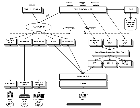 最新的TAPI 3.0基于微軟的COM標(biāo)準(zhǔn),它允許TAPI應(yīng)用程序采用包括JAVA?、Visual Basic?、Visual C++?在內(nèi)的各種語言進(jìn)行編寫,同時還可以方便的通過ActiveX技術(shù)將其移植到互聯(lián)網(wǎng)中去。TAPI除了支持傳統(tǒng)的電話應(yīng)用,還支持標(biāo)準(zhǔn)的H.323會議和IP多點會議,良好的QoS支持使得它增強了會議的質(zhì)量和網(wǎng)絡(luò)的可管理性。TAPI采用了統(tǒng)一的媒體流接口-DirectShowTM,TAPI媒體流提供商(MSP)只要針對不同的電話提供商(TSP)來實現(xiàn)DirectShowTM接口就可以被應(yīng)用程序使用。