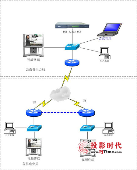 云南電力的視頻會議系統(tǒng)就是這樣一套典型的能源行業(yè)視訊應(yīng)用。一期工程視頻方案基于H.323標(biāo)準(zhǔn),以路由器連接專線(或DDN、幀中繼)為傳輸媒介,全省會議電視用戶以星形網(wǎng)絡(luò)結(jié)構(gòu)通過路由器聯(lián)接。全網(wǎng)由多點會議服務(wù)器DST H.323 MCS多點控制單元、VTEL銀河GALAXY 755及725型多媒體會議電視終端組成,全網(wǎng)運行速率64Kb/s--1920 Kb/s,分級可調(diào)。中心會場設(shè)在云南省電力局大樓內(nèi)。在省電力局采用DST H.323 MCS多點控制單元,可連接32個用戶,終端采用GALAXY多媒體會議電視終端。除在省電力局本地會場直接接入HUB外,其他會場通過路由器接入,在路由器中運行RSVP協(xié)議。