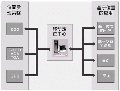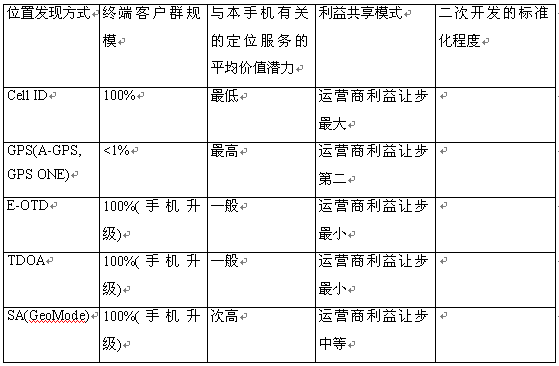 根據(jù)位置發(fā)現(xiàn)策略的不同,已經(jīng)有很多的成熟技術可選---Cell ID、GPS(A-GPS = GPS + Cell ID)、TDOA/E-OTD/TDOA、SA(信號衰減,