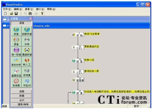 兩個(gè)集成環(huán)境,Easy Studio負(fù)責(zé)自動(dòng)語音流程的編輯和調(diào)試,EasyAdmin負(fù)責(zé)對(duì)語音卡硬件的操作和按照EasyStudio生成的具體語音流程的實(shí)現(xiàn)。EasyCTI綜合實(shí)現(xiàn)了呼叫中心中IVR(Interactive