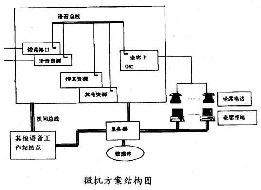 這種方案以近幾年發(fā)展迅速的微機語音處理技術(shù)為基礎(chǔ),其基本思想是在微機平臺上集成各種功能的語音處理卡,完成通信接口、語音處理、傳真處理、坐席轉(zhuǎn)接等功能,再結(jié)合外部的計算機網(wǎng)絡(luò)實現(xiàn)各種應(yīng)用系統(tǒng)的需求。