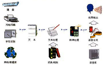 -----按照人類言語功能的不同層次,語言合成也可分成三個層次,它們是:(1)從文字到語音的合成(Text-To-Speech);(2)從概念到語音的合成(Concept-To-Speech);(3)從意向到語音的合成(Intention-To-Speech)。這三個層次反映了人類大腦中形成說話內(nèi)容的不同過程,涉及人類大腦的高級神經(jīng)活動。不難想象,即使是按規(guī)則的文字到語音合成(文語合成)也已經(jīng)是相當困難的任務。為了合成出高質(zhì)量的語言,除了依賴于各種規(guī)則,包括語義學規(guī)則、詞匯規(guī)則、語音學規(guī)則外,還必須對文字的內(nèi)容有很好的理解,這將涉及自然語言理解的問題。從這一點講,文語轉(zhuǎn)換系統(tǒng)實際上也可看作一個人工智能系統(tǒng)。圖1顯示了一個完整的文語轉(zhuǎn)換系統(tǒng)示意圖。文語轉(zhuǎn)換過程是先將文字序列轉(zhuǎn)換成音韻序列,再由語音合成器生成語音波形。其中第一步涉及語言學處理,例如分詞、字音轉(zhuǎn)換等,以及一整套有效的韻律控制規(guī)則;第二步需要先進的語音合成技術,能按要求實時合成出高質(zhì)量的語音流。因此一般說來,文語合成系統(tǒng)都需要一套復雜的文字序列到音素序列的轉(zhuǎn)換程序,也就是說,文語轉(zhuǎn)換系統(tǒng)不僅要應用數(shù)字信號處理技術,而且必須有大量的語言學知識的支持。當然其中語音合成終究還是最基本的部分,它相當于“人工嘴巴”,任何語言合成系統(tǒng)包括文語轉(zhuǎn)換系統(tǒng),都離不開語音合成器。