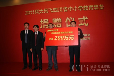 CTI論壇(ctiforum)11月11日消息(記者 潘婷婷): 2011年11月10日,科大訊飛在成都嬌子國際會議中心舉行了隆重的捐贈儀式,向四川省各市、地州中小學(xué)捐贈了價值200萬元的暢言系列教學(xué)產(chǎn)品。會議由四川省教育廳技術(shù)物資裝備處處長張生主持,四川省教育廳副廳長張林祥、科大訊飛副總裁徐玉林在儀式上致辭,來自各市、地州教育主管部門領(lǐng)導(dǎo)、各縣區(qū)教育局負(fù)責(zé)人、受贈學(xué)校教師代表,以及相關(guān)媒體共100多人等參加了捐贈儀式。