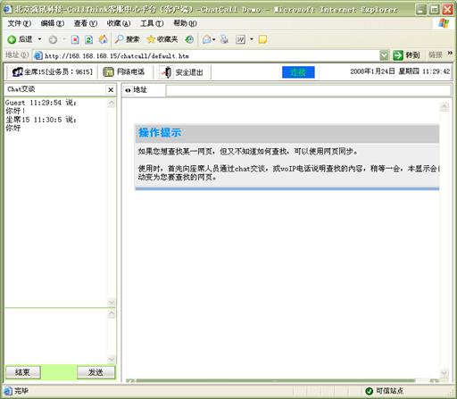 網(wǎng)頁同步:客戶在通過"客服代表回復(fù)"、"互聯(lián)網(wǎng)電話"、"文字交談"等方式與客服代表進(jìn)行實(shí)時(shí)交流時(shí),還可以通過網(wǎng)頁同步功能,與客戶代表的瀏覽器進(jìn)行同步。這樣,客戶與客戶代表看到的是同一網(wǎng)頁,由客戶代表引導(dǎo)客戶對網(wǎng)頁進(jìn)行瀏覽,找到所需要的信息。網(wǎng)頁同步功能適用于不同的實(shí)時(shí)交流方式,可以大大提高客戶服務(wù)的效率和質(zhì)量。如圖14、15所示: