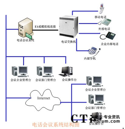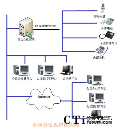 TalenTel CNF電話會議系統(tǒng)可以與程控交換機(jī)配合使用,也可以直接與局方的系統(tǒng)進(jìn)行連接,系統(tǒng)的構(gòu)成含如下幾部分:TalenTel CNF電話會議系統(tǒng)服務(wù)器(ctsIVR)、會議企業(yè)管理員模塊、會議部門管理員模塊、會議操作員管理模塊、數(shù)據(jù)庫等組成。