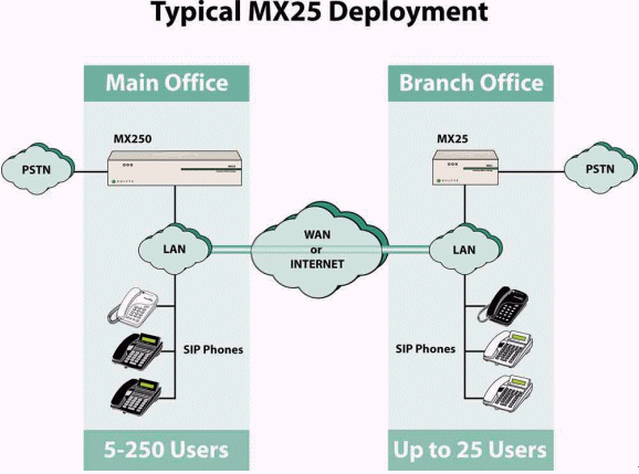 當(dāng)與MX250一起使用時(shí), MX25提供了一種既能將MX250的功能擴(kuò)展至分支機(jī)構(gòu),同時(shí)又可確保該分支機(jī)構(gòu)與PSTN有效連接的低成本的解決方案。遠(yuǎn)程機(jī)構(gòu)的工作人員同樣可以使用語(yǔ)音信箱、自動(dòng)話務(wù)員、在線狀態(tài)和即時(shí)消息等功能。如同在總部工作一樣這些遠(yuǎn)程機(jī)構(gòu)的工作人員可以與企業(yè)內(nèi)部任意其它地點(diǎn)的人員進(jìn)行溝通,也可以擔(dān)當(dāng)接線員或ACD(自動(dòng)話務(wù)分配)組成員的工作。