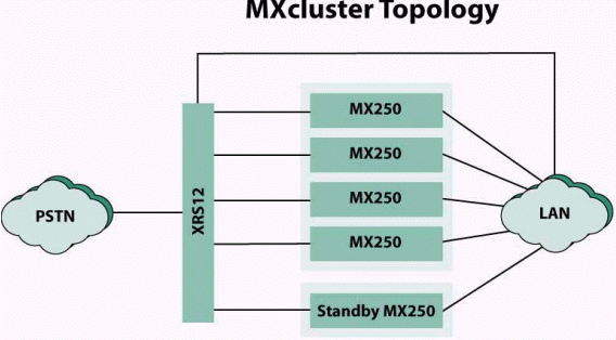 為支持冗余配置蘇迪思科技公司同時推出新產(chǎn)品XRS12物理連接轉換開關。XRS12可被安裝在19英吋的機架上,并將占用機架中的1RU單元。MXcluster集群中每一臺MX250上的PSTN線路均通過XRS12連接至PSTN網(wǎng)絡。當某一臺MX250出現(xiàn)故障時,XRS12自動將與該臺MX250對應的PSTN網(wǎng)絡線路轉接至備份MX250上。使用XRS12,無需管理員介入操作,即可實現(xiàn)MXcluster集群與PSTN的不間斷連接。