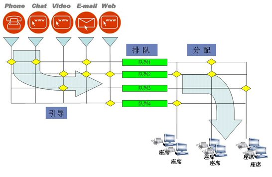 對(duì)于多種媒體采用統(tǒng)一的ACD處理方式,經(jīng)過(guò)引導(dǎo),進(jìn)入不同的隊(duì)列,分配到不同的坐席組。