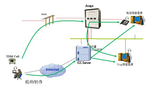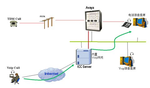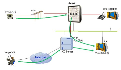 通過(guò)Internet來(lái)的Voip呼叫通過(guò)ICC服務(wù)器轉(zhuǎn)接到座席。