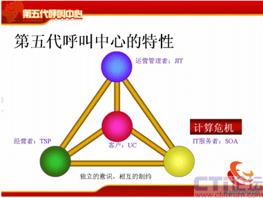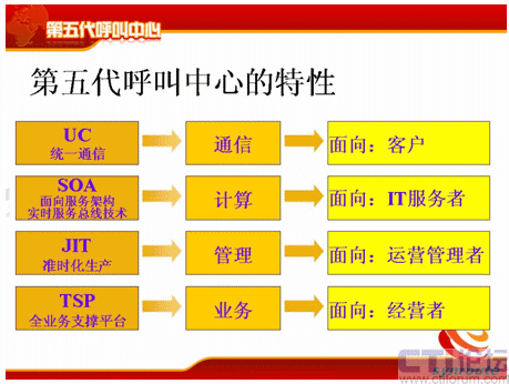 從分代上來講,和何總說的稍微有點差異,但是基本上一樣的,第一代是人工熱線的電話系統(tǒng),時間點也差不多;第二代是有了座席IVR、自動語音應答這個特點;第三代是有了CTI、ACD企業(yè)級的呼叫中心;第四代是互聯(lián)網,有VOIP、多媒體等等這些多媒體的呼叫中心。那么第五代是什么?第五代的典型特征是融合共享,它是有四個特性,UC、SOA、JIT和TSP,這是五代的幾個主要特點。