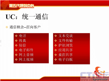 那么這幾個特點稍微簡單地說一下,可能大家了解比較多了,從UC上來講,不管是現(xiàn)在國際上比較領先的通信廠商,CISCO、華為都在提UC的概念,軟件行業(yè)包括微軟。UC包括了通信的渠道,包括電話、傳真、短信、電子郵件、網上音頻、視頻,文本交談,文件傳輸、護航瀏覽、應用共享、桌面共享等等,這是統(tǒng)一通信的部分。