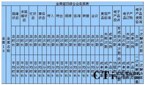c)如果想對這個(gè)組的坐席進(jìn)行整體的坐席狀態(tài)進(jìn)行考核,以便確定工作負(fù)荷、績效考核,形成每天、每月、每季度、每年、按組、按技能,平均、總計(jì)、總合、最大、最小數(shù)據(jù)比較的表格、圖表,對不起要么你放棄這個(gè)想法,要么你重新開發(fā)軟件進(jìn)行計(jì)算。