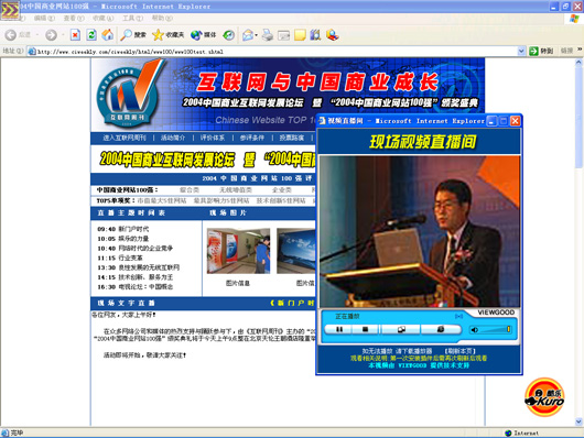 作為此次活動(dòng)全程流媒體直播技術(shù)提供商VIEWGOOD(www.viewgood.com)商務(wù)主管在活動(dòng)現(xiàn)場(chǎng)說(shuō):“中國(guó)大陸的上網(wǎng)用戶總?cè)藬?shù)即將突破1億,中外商業(yè)網(wǎng)站的資本運(yùn)作空前活躍,3G、IPv6等新技術(shù)將催生互聯(lián)網(wǎng)的新一輪變革,網(wǎng)絡(luò)媒體正在從“第四媒體”快速走向“第一媒體”,致力為中國(guó)互聯(lián)網(wǎng)媒體服務(wù)的VIEWGOOD和所有的網(wǎng)站一樣,既面臨著激烈的挑戰(zhàn),更面臨著難得的發(fā)展機(jī)遇。無(wú)論是成長(zhǎng)最快的網(wǎng)站、最具潛力的網(wǎng)站,還是創(chuàng)新最佳的網(wǎng)站,都是VIEWGOOD的合作伙伴。我們將以國(guó)際最先進(jìn)的流媒體技術(shù)服務(wù)于中國(guó)互聯(lián)網(wǎng)!