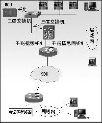 綜合業(yè)務(wù)數(shù)據(jù)網(wǎng)上的信息網(wǎng)VPN,連接省公司和各市公司的局域網(wǎng),桌面終端分布于省市兩級(jí)的局域網(wǎng)上。MCU通過(guò)三層交換方式接入省公司的信息網(wǎng),實(shí)現(xiàn)各個(gè)桌面會(huì)議終端的接入。在信息網(wǎng)上,要設(shè)置路由的QoS,實(shí)現(xiàn)桌面視音頻業(yè)務(wù)的優(yōu)先傳送。