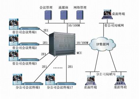 該系統(tǒng)基于蘇州科達公司KDV系列視頻會議產品,全網采用1套MCU、20套會議室型終端和200多套桌面型終端,其中會議室型終端通過2條E1線路捆綁與MCU相連、桌面型終端通過10/100M以太網和IP數據網與MCU相連。總體網絡結構如下圖所示: