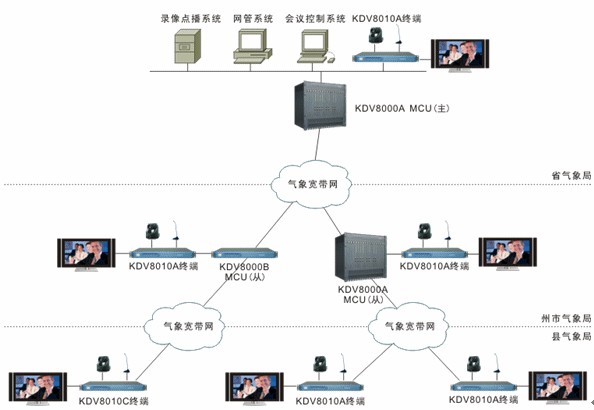 整個系統(tǒng)依托云南省氣象局自建的寬帶IP網(wǎng)絡(luò)進行搭建。省氣象局與各州市氣象局的網(wǎng)絡(luò)連接可為視頻會議提供2M通信帶寬。各州市氣象局與各縣級氣象局的網(wǎng)絡(luò)連接可為視頻會議提供768K通信帶寬。整個系統(tǒng)采用MCU兩級級聯(lián)組網(wǎng)。