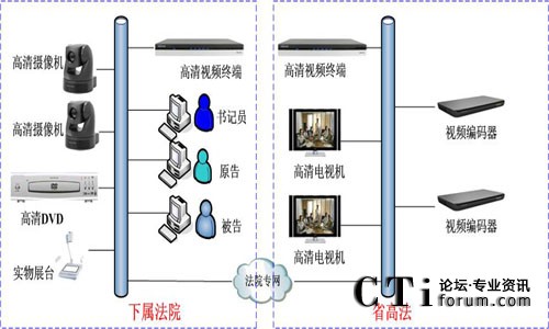 系統(tǒng)覆蓋省高院法庭、8個地市中院法庭和58個基層法庭。系統(tǒng)利用法院專用IP傳輸網(wǎng)絡(luò),以省高院各法庭為一級中心,地市中院為分控中心,基層法院為末端接入。在省高院中心、地市中院和基層分院設(shè)立遠(yuǎn)程數(shù)字庭審中心,配置庭審視頻終端、專用攝像機(jī)和麥克風(fēng),實現(xiàn)圖像傳輸和遠(yuǎn)程通信。