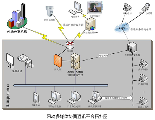 在上圖所示的Active Office客戶應用圖中,網動協同通訊平臺承擔了統(tǒng)一通信中心樞紐的作用,將語音、視頻、數據完美結合,使IP網絡與電話網絡、本地網絡與遠程網絡互聯互通,在同一個平臺上交互協同。