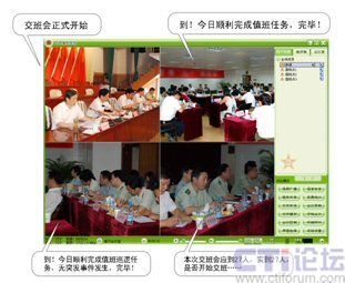 網(wǎng)動(dòng)視頻會(huì)議系統(tǒng)的“多功能”使得某軍區(qū)對(duì)其應(yīng)用又作了新發(fā)現(xiàn),它把視頻會(huì)議系統(tǒng)與原有的作戰(zhàn)值班系統(tǒng)進(jìn)行了結(jié)合,通過(guò)網(wǎng)絡(luò)實(shí)現(xiàn)值班情況的可視通播和值班員之間的雙向音視頻實(shí)時(shí)交流,從而實(shí)現(xiàn)值班過(guò)程中對(duì)交接班的工作匯報(bào)以及突發(fā)事件的應(yīng)急處理。