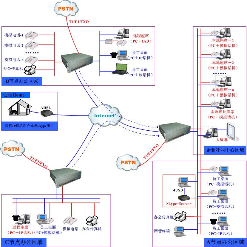 各區(qū)域內(nèi)部員工可以進(jìn)行0話費(fèi)的通話和傳真外,還可以非常輕松的實(shí)現(xiàn)長途旁路功能 (即長途費(fèi)用變市話費(fèi)用功能);同時(shí)每部分機(jī)同時(shí)具有一個(gè)真實(shí)的當(dāng)?shù)厥性捥柎a和一個(gè)內(nèi)部分機(jī)號。