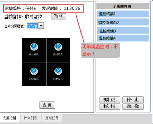 監(jiān)控計(jì)劃規(guī)定了監(jiān)控系統(tǒng)何時(shí)以何種方式在大屏上顯示多個(gè)現(xiàn)場的監(jiān)控畫面。監(jiān)控畫面可輪詢,可調(diào)整設(shè)置畫面分屏顯示模式;可以固定在某位置顯示某監(jiān)控畫面;可以切換到險(xiǎn)情聯(lián)動(dòng)監(jiān)控模式?梢耘c監(jiān)控畫面喊話;監(jiān)控錄像;保存畫面等功能。