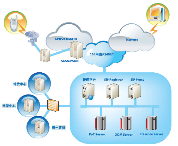 POC(Push-to-talk Over Cellular)是基于蜂窩移動(dòng)通信網(wǎng)絡(luò)的PTT(Push To Talk)業(yè)務(wù)。POC通過(guò)半雙工VoIP技術(shù)來(lái)實(shí)現(xiàn)PTT,利用GPRS或CDMA1X等網(wǎng)絡(luò)“永遠(yuǎn)在線”的優(yōu)勢(shì),節(jié)省運(yùn)營(yíng)成本,同時(shí)為傳統(tǒng)移動(dòng)用戶(hù)提供全新的業(yè)務(wù)形式。在支持GPRS/CDMA1X網(wǎng)絡(luò)的同時(shí),東信北郵手機(jī)一鍵通平臺(tái)系統(tǒng)亦支持IMS網(wǎng)絡(luò)。