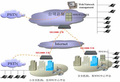 如圖,利用大唐高鴻的VoIP產(chǎn)品MG3000-T4或者M(jìn)G3000-A/R系列,可以根據(jù)實(shí)際遠(yuǎn)端用戶數(shù)量選擇相應(yīng)產(chǎn)品,將多個(gè)呼叫中心通過IP網(wǎng)絡(luò)匯接,從而實(shí)現(xiàn)呼叫中心到各地客戶的低廉話費(fèi),節(jié)省呼叫中心整體運(yùn)營、管理費(fèi)用。