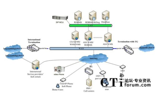 計(jì)費(fèi)系統(tǒng)將把視頻通話和普通的語音通話分開來計(jì)費(fèi),視頻會(huì)議業(yè)務(wù)也可以作為一項(xiàng)特殊業(yè)務(wù)單獨(dú)計(jì)費(fèi)。所有這些業(yè)務(wù)都使用相同的計(jì)費(fèi)和OAM系統(tǒng)。在這個(gè)運(yùn)營(yíng)商級(jí)軟交換系統(tǒng)中,已經(jīng)把視頻業(yè)務(wù)完全集成進(jìn)了系統(tǒng)。下面是網(wǎng)絡(luò)示意圖: