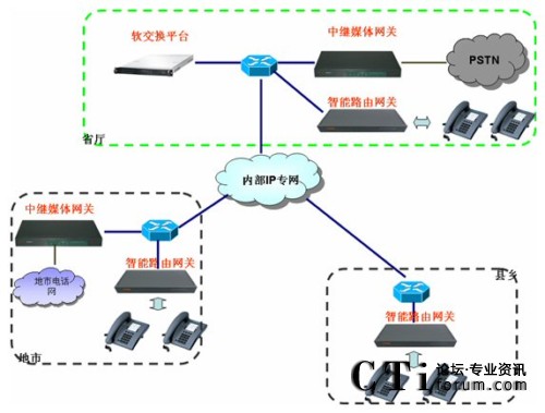 通過上述三環(huán)節(jié),即在財政內(nèi)部網(wǎng)上建立了一套跨區(qū)域的電話系統(tǒng)。拓?fù)涫疽鈭D如下: