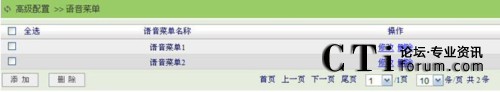 點擊“高級配置”菜單的“語音菜單”子菜單,進入語音菜單頁面,頁面默認顯示系統(tǒng)已經(jīng)配置的所有語音菜單列表信息,在這里用戶可以創(chuàng)建新的語音菜單、修改刪除已有的語音菜單,如下圖所示: