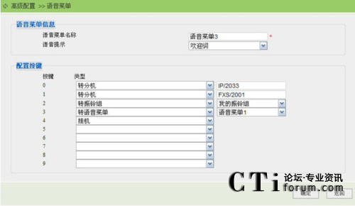 在此頁面可以定義語音菜單的名字,可以指定進入此菜單后播放的音樂,還可以為每個鍵選擇合適的操作。支持0-9數(shù)字按鍵定義,每個鍵可選擇如下五個動作之一: