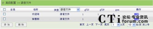 點擊“高級配置”菜單的“語音文件”子菜單,進入語音文件頁面,在類型選項中可以選擇顯示語音文件或音樂保持文件,語音文件指的是語音菜單、振鈴組等業(yè)務使用的語音文件;音樂保持文件指的是呼叫保持,三方通話等業(yè)務用戶聽到的音樂保持文件。如下圖所示: