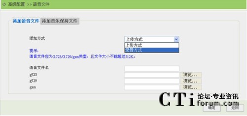 點擊“添加”鏈接按鈕,進入語音文件添加頁面,用戶可以選擇上傳方式或者錄音方式來添加語音文件。如下圖所示: