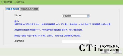 選擇錄音方式添加語音文件時,使用分機撥打電話錄制語音文件功能鍵“*77”,聽到滴聲后開始錄制,按“#”號結束錄制。然后通過“高級配置”->“語音文件”,點擊“添加”鏈接按鈕進入添加語音文件頁面,選擇添加方式為錄音方式,在語音文件名處為剛剛電話錄制的音文件,添加一個文件名后,點擊“確定”完成語音文件添加,如下圖所示: