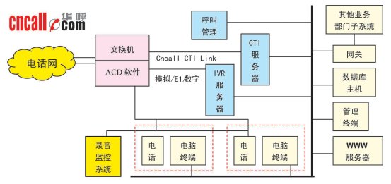 華呼(www.cncall.com)典型的基于交換機(jī)平臺廣電呼叫中心解決方案的主系統(tǒng)包括:PBX交換機(jī)平臺、計(jì)算機(jī)電話集成系統(tǒng)(CTI)、交互式語音應(yīng)答系統(tǒng)(IVR/IFR)、人工座席系統(tǒng)、電話錄音監(jiān)聽管理系統(tǒng)CCLog、呼叫中心管理系統(tǒng)CCM、數(shù)據(jù)庫應(yīng)用系統(tǒng)、WWW服務(wù)器、應(yīng)用網(wǎng)關(guān)。