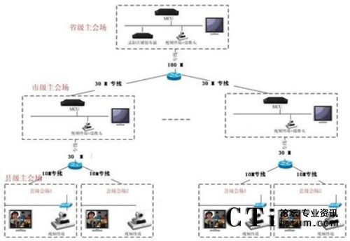 本方案整體采用基于IP網絡,在省、市中心機房放置MCU,通過網線接入核心交換網絡;在會議室放置視頻終端,通過郵政專網進行互聯(lián)。一級系統(tǒng)以省中心會議室為主會場,下屬各市會議室為分會場組成邏輯星形拓撲結構;二級系統(tǒng)以市州郵政局會議室為主會場,下屬各區(qū)縣郵政局會議室為分會場。兩級系統(tǒng)通過MCU級聯(lián)互通,形成一個樹形的拓撲結構。系統(tǒng)主要由全視頻會議管理系統(tǒng)、純硬件MCU、純硬件1080P高清會議終端等組成,采用MCU為中心的星形結構建立一個數字連接的、專業(yè)的視頻會議系統(tǒng)。視頻會議系統(tǒng)可由省郵政廳視頻會議中心控制,任意切換參會市、州(分中心)、縣、市、區(qū)(終端)的會議畫面。視頻會議系統(tǒng)可以指定任意參會單位發(fā)言并實現(xiàn)全省會場統(tǒng)一的畫面切換。視頻會議系統(tǒng)可實現(xiàn)省郵政局集中控制與管理,易于使用,能進行遠程管理、遠程維護、可降低維護成本。通過授權,各級單位可自行組織、控制會議,方便各級單位的使用。