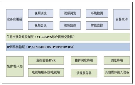 在系統(tǒng)功能模塊中,各模塊均依賴于VC3-6000綜合管理控制平臺,即相對獨立,又可有機結合。這些功能模塊通過專用應用軟件和計算機硬件平臺的結合,實現(xiàn)其各種功能。其中綜合管理控制平臺和指揮調度主模塊是系統(tǒng)的基礎,可以實現(xiàn)系統(tǒng)的指揮調度、視頻會議、視頻監(jiān)控主要功能。圖