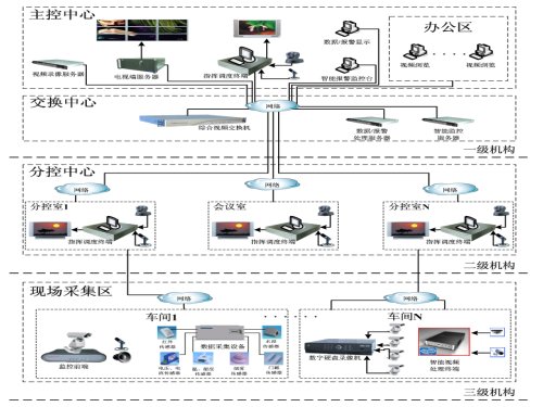 圖 4是一個典型的電力企業(yè)綜合視頻指揮調度系統(tǒng)網(wǎng)絡拓撲圖,在地理上可分一級機構(主控中心操作顯示區(qū)、信息控制交換處理區(qū))、二級機構(分控中心操作區(qū))、三級機構(現(xiàn)場音視頻、數(shù)據(jù)、智能監(jiān)控點采集區(qū))。
