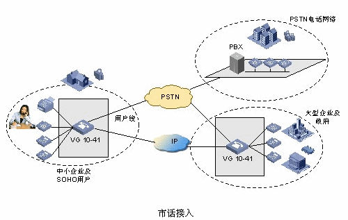 - 同時,VG 語音網(wǎng)關還提供FXO接口直接連接本地市話PSTN網(wǎng)絡,從而實現(xiàn)SOHO用戶直接與市話連通,這種市話接入方式可以作為IP電話應用的靈活備份,一方面節(jié)省了用戶投資,另一方面提供了意外情況(如停電)的處理方案。